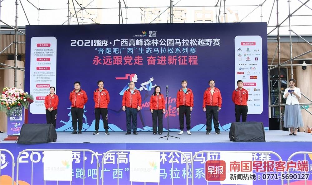 在开幕仪式上,高峰林场党委书记陆湘云,踏秀中国创始人文军共同为2021踏秀·广西高峰森林公园马拉松越野赛“奔跑吧广西”生态马拉松系列赛鸣枪发令。