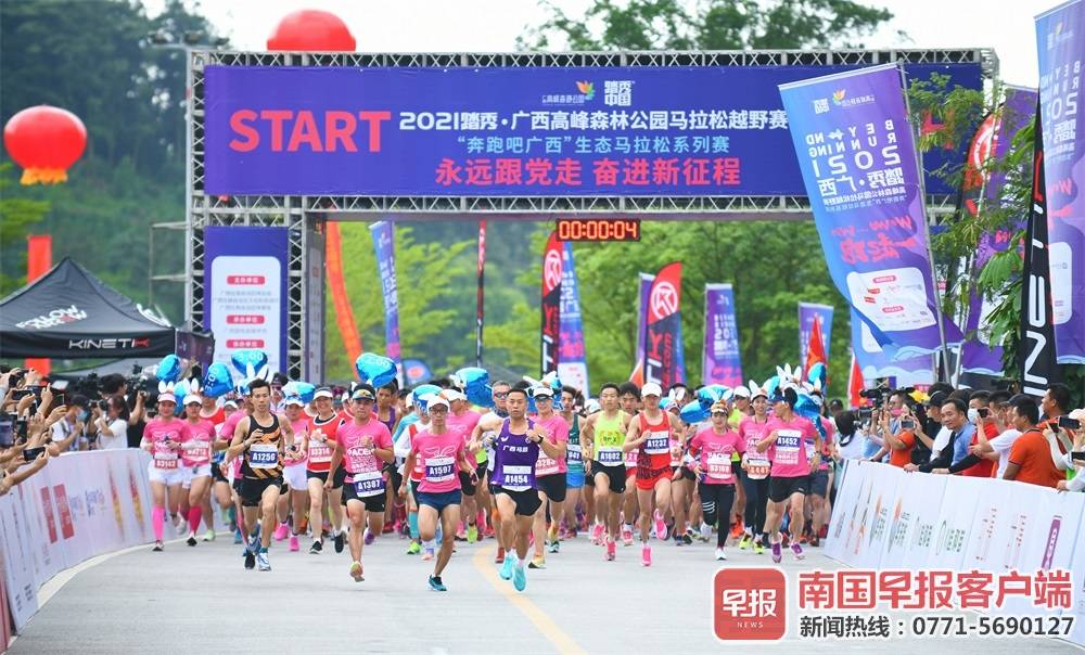 5月16日上午,2021踏秀·广西高峰森林公园马拉松越野赛“奔跑吧广西”生态马拉松系列赛在高峰森林公园开赛,吸引了来自全国各地的3600名专业选手和跑步爱好者。
