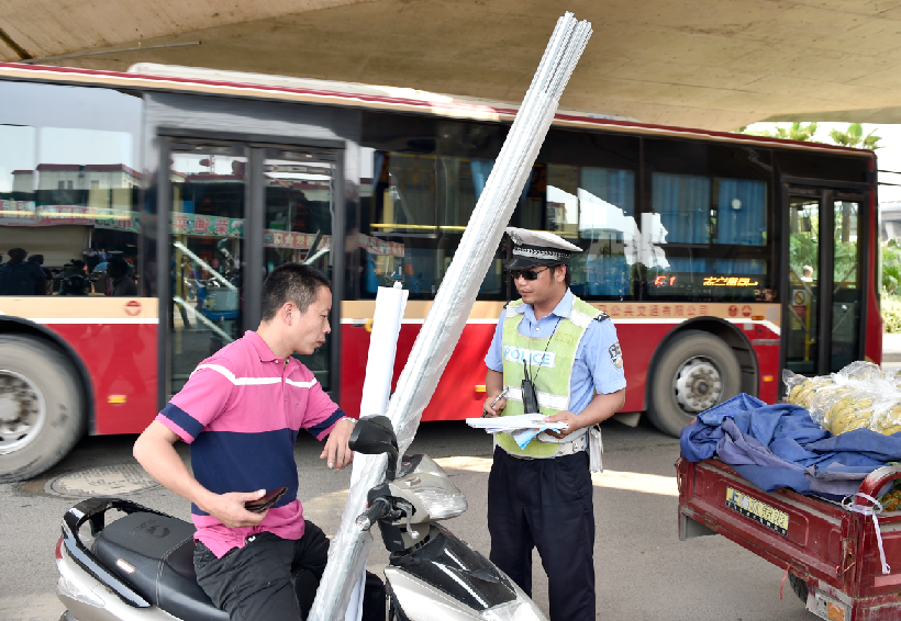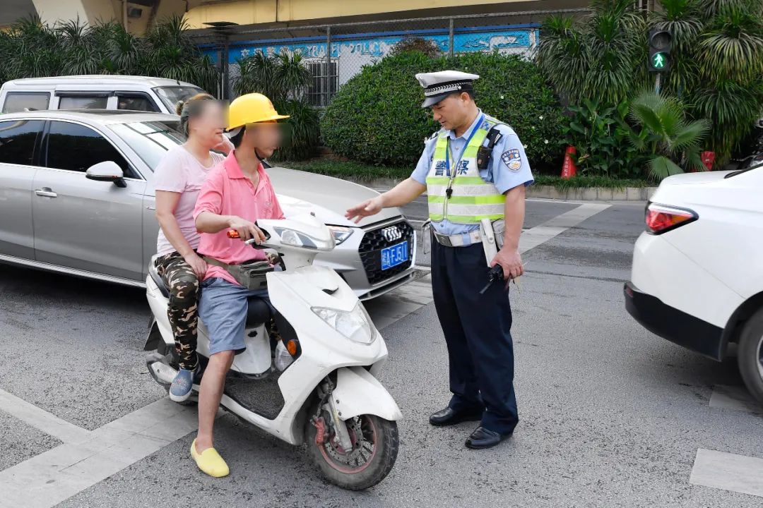 一位大叔骑电动车载着爱人,只有自己戴了头盔。“出来得急,不记得戴了。”二人解释道。执勤交警对二人进行批评教育,并引导到旁边的学习点进行学习。