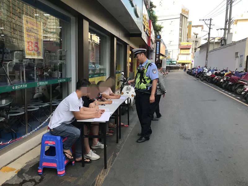 部分上班族因为未带安全头盔被查处后,考虑到他们实际情况,民警柔性执法,让他们先去上班,记录好信息后,择时再前来学习点学习。