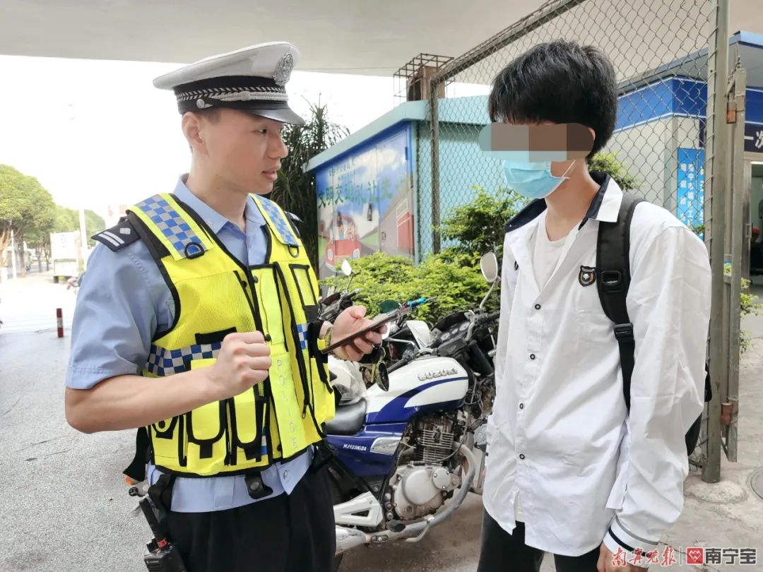 整治查处行动中,一名初中生也因为骑车未戴头盔被查处,因为其赶着去上课,民警先将其放行,但过后还需回来学习,并通报其所在学校。