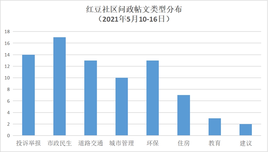据统计,5月10-16日期间,网民反映各类问题较多,其中市政民生类问题最多,占比达21%;其次,投诉举报、道路交通和环保类问题也较为突出,占比分别为18%、16%和16%;本期有关城市管理和住房建设类的帖文也较多,占比分别为13%、9%;另外,涉及教育类问题的帖文占比为4%。