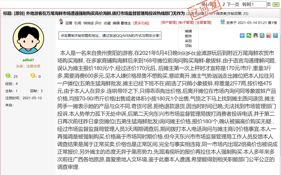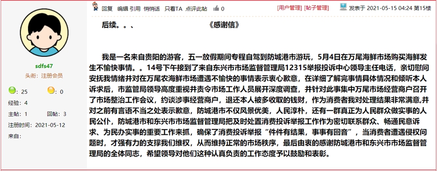5月14日,防城港市市场监督管理局对《外地游客在万尾海鲜市场遭遇强制购买高价海鲜,拨打市场监督管理局投诉热线部门无作为》一帖进行回复: