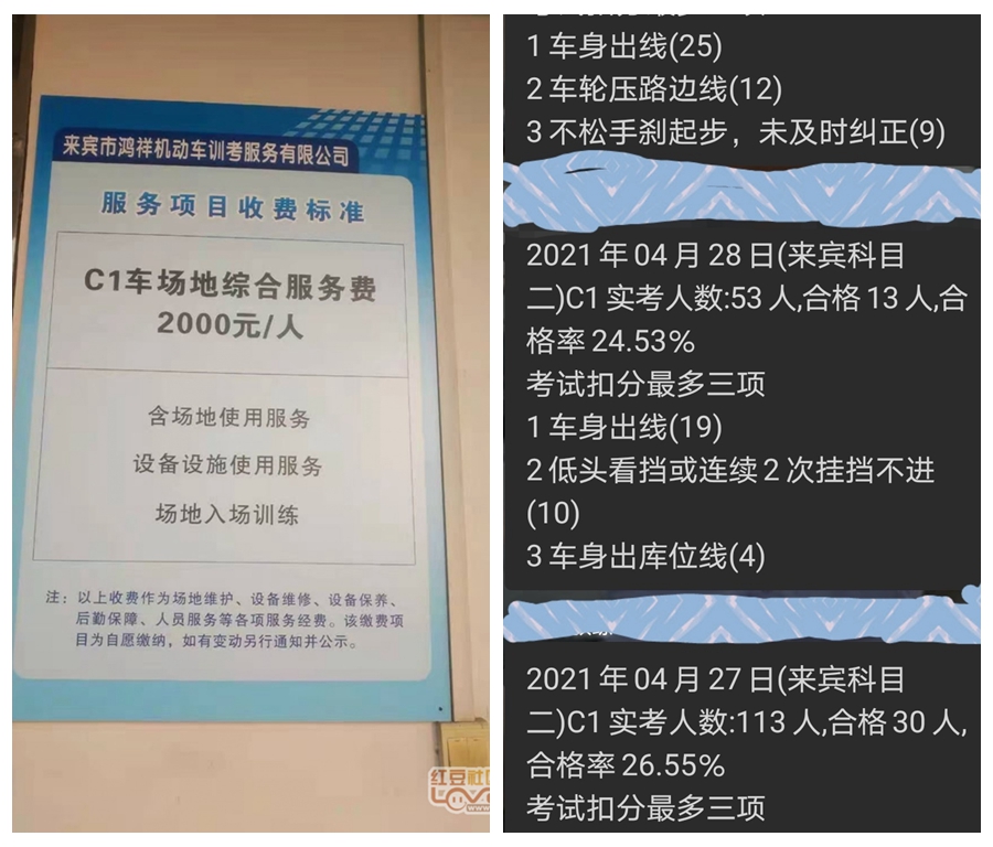 5月6日,来宾网友反映:来宾市驾考科目二考场收取适应场地费高达2000元/人,因为来宾只有一个考场,存在垄断行为,且考试车坏了也置之不理,考试合格率低。