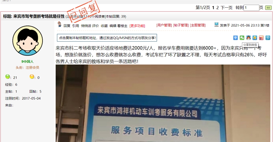 5月12日,来宾市市场监督管理局对《来宾市驾考垄断考场就是任性》一帖进行回复:
