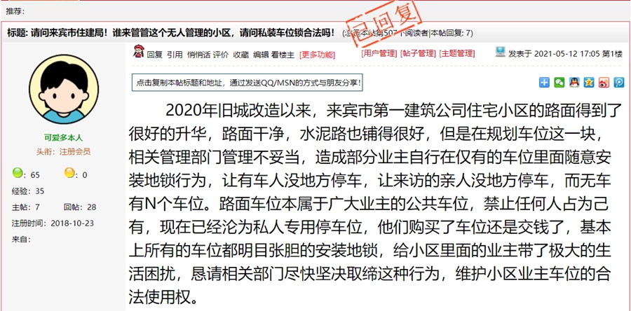 5月13日,来宾市兴宾区城东街道办对《请问来宾市住建局!谁来管管这个无人管理的小区,请问私装车位锁合法吗!》一帖进行回复: