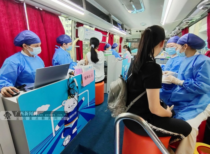 当日,两辆移动接种车开至南宁师范大学师园学院为师生们接种新冠病毒疫苗,预计接种1760人份。