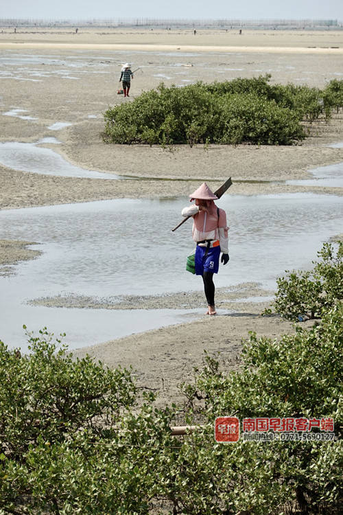▲5月19日,广西北海市烈日炎炎,渔民在滩涂捕获沙蟹贝类后挑担上岸。南国早报客户端记者邹财麟摄