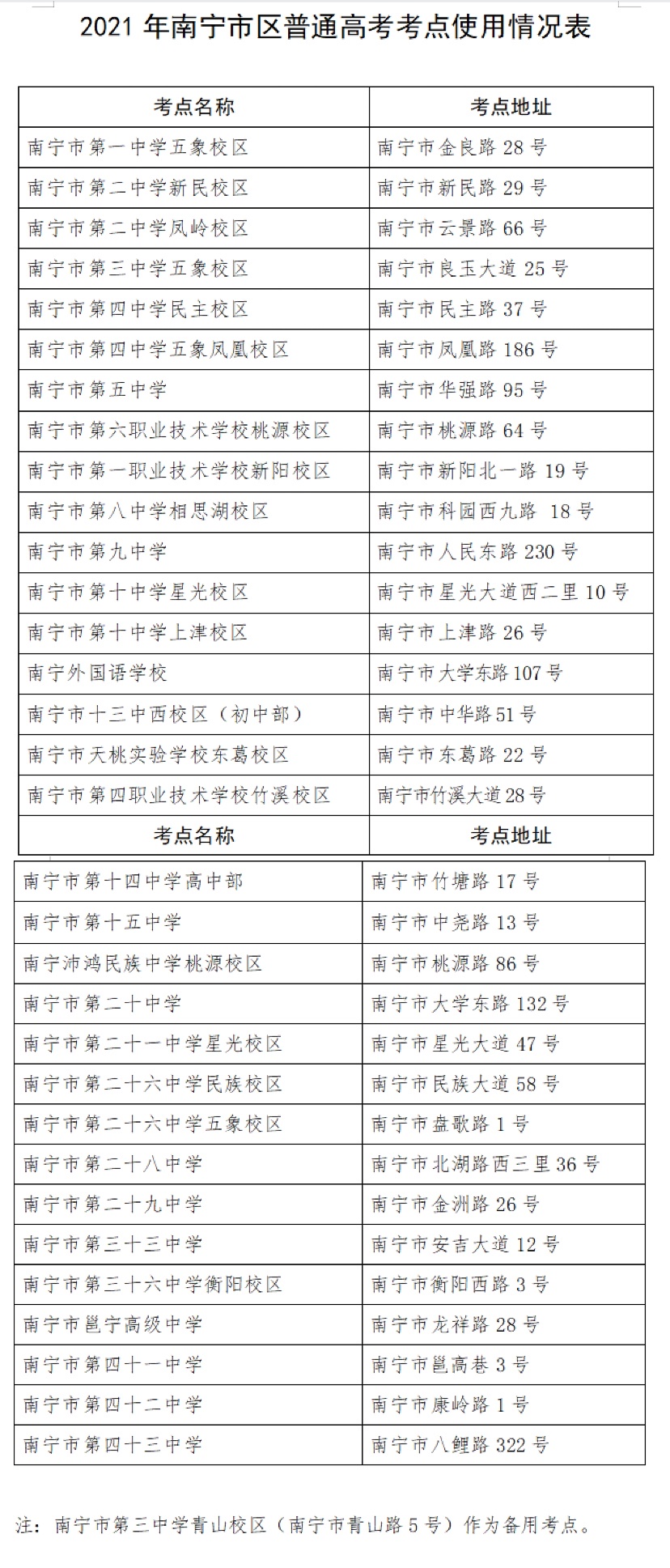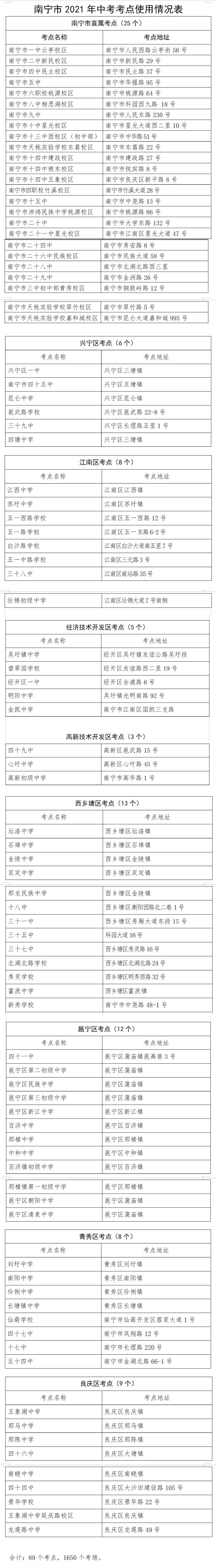 全市设南宁市市区、横县、宾阳县等7个考区,南宁一中五象校区、南宁二中新民校区等51个考点,共1886个考场。今年南宁市武鸣考区新增一所普通高考考点,即广西-东盟经济技术开发区华侨中学考点。