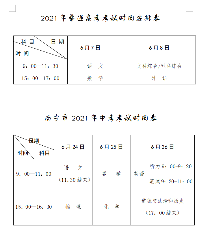 考试时间为:6月24日(上午语文,下午物理),6月25日(上午数学,下午化学),6月26日(上午英语,下午道德与法治和历史)。