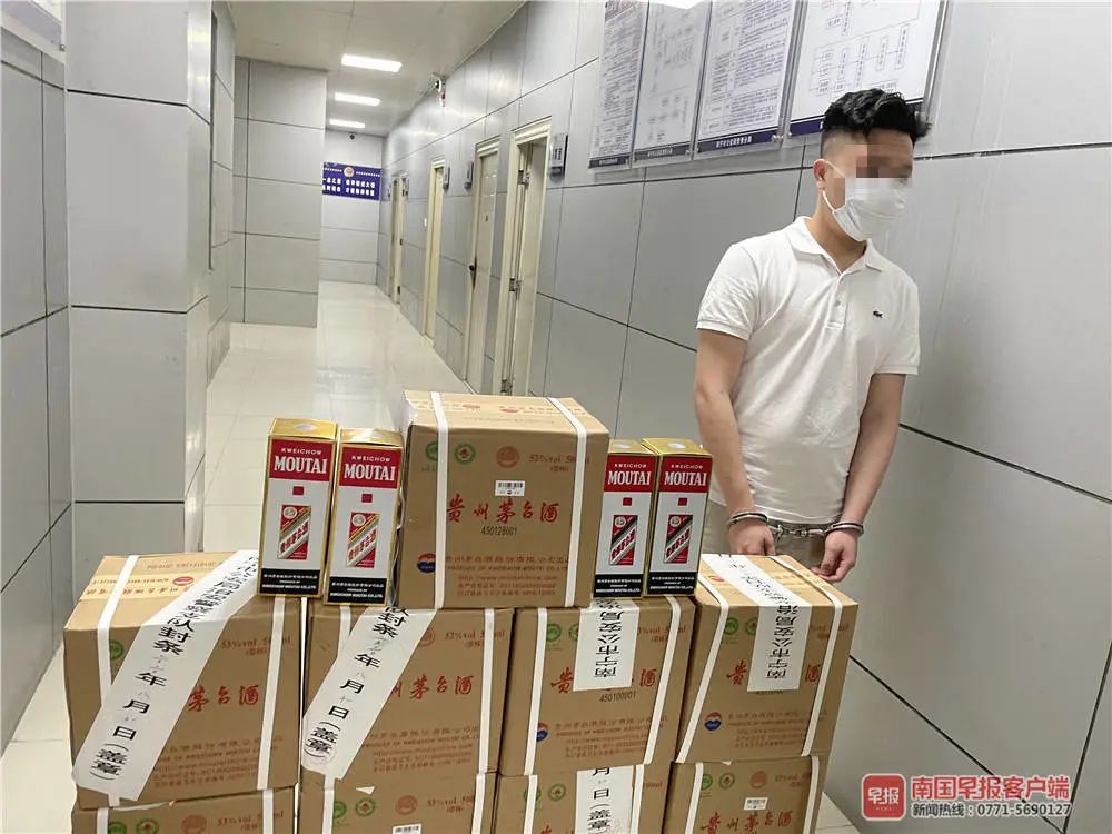 同年11月,民警锁定从玉林来南宁的男子周某有重大作案嫌疑。今年5月19日,民警将正在送货的周某抓获,并当场缴获24瓶假冒飞天茅台酒。