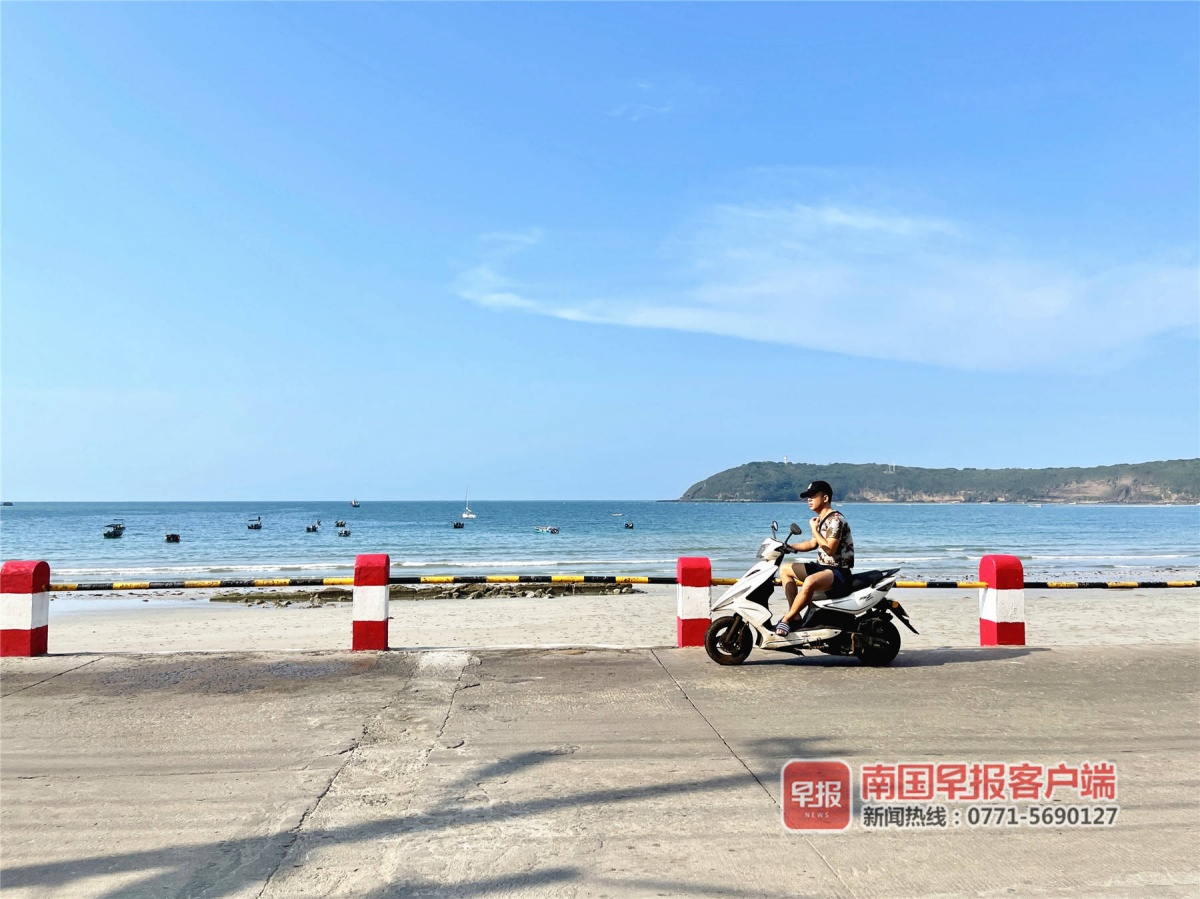 ▲5月21日上午8时许,北海市涠洲岛气温已超过30℃,一村民骑电动车从南湾街经过。南国早报客户端记者邹财麟摄