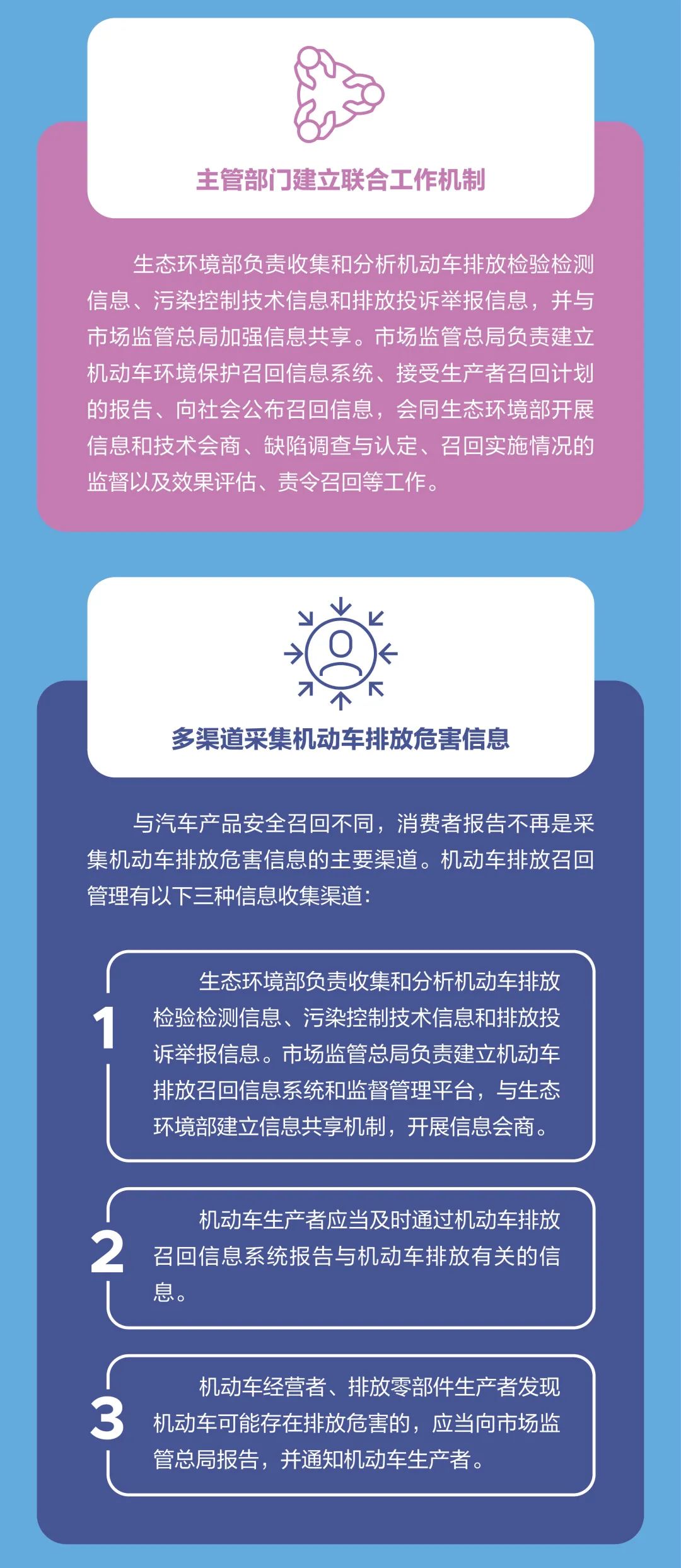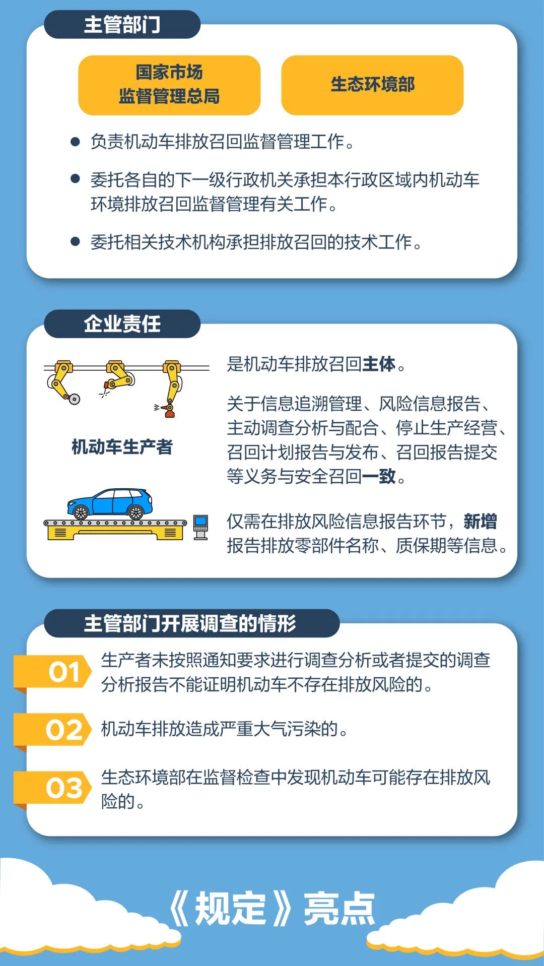 《规定》第十四条指出,生态环境部在大气污染防治监督检查中发现机动车可能存在排放危害的,市场监管总局会同生态环境部可以对机动车生产者进行调查,必要时还可以对排放零部件生产者进行调查。