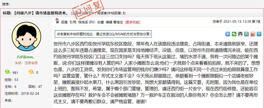 5月21日,贺州市八步区城市管理综合执法局对《请市场监管局进来》一帖进行回复: