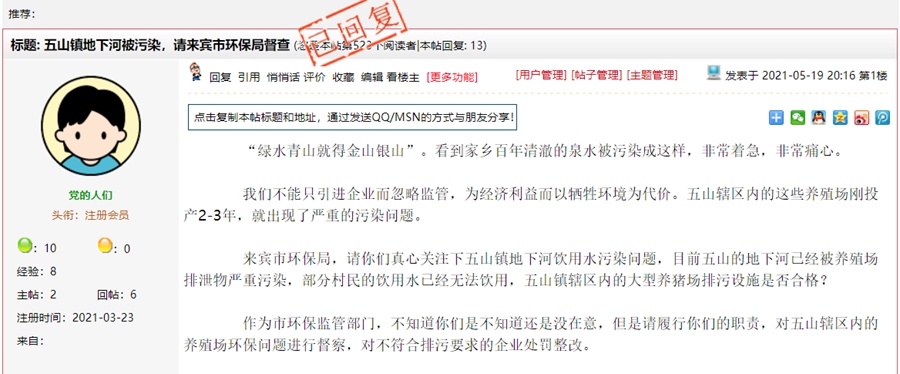 5月19日, 来宾市兴宾生态环境局对《五山镇地下河被污染,请来宾市环保局督查》一帖进行回复:
