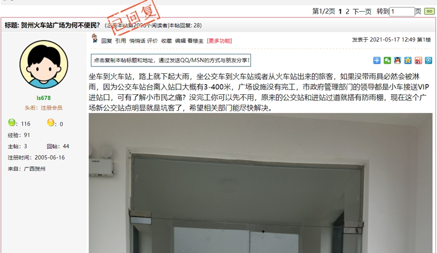 5月21日,贺州市东融新区管委会对《贺州火车站广场为何不便民?》一帖进行回复: