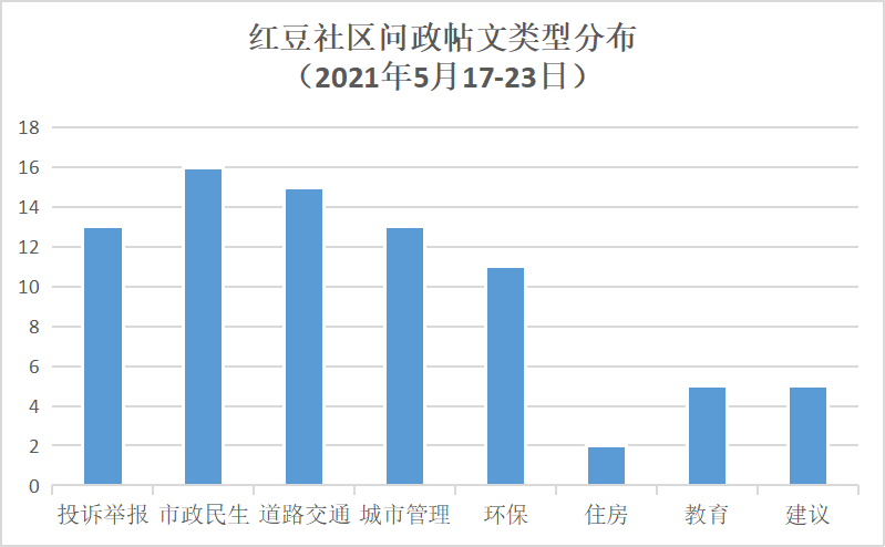 据统计,5月17-23日期间,网民反映各类问题较多,其中市政民生类问题最多,占比达20%;其次为道路交通类问题,占比为19%;本期有关投诉举报和城市管理类帖文也较为突出,占比均为16%;另外,涉及环保类帖文占比为14%;教育类问题的帖文也受到一定关注。