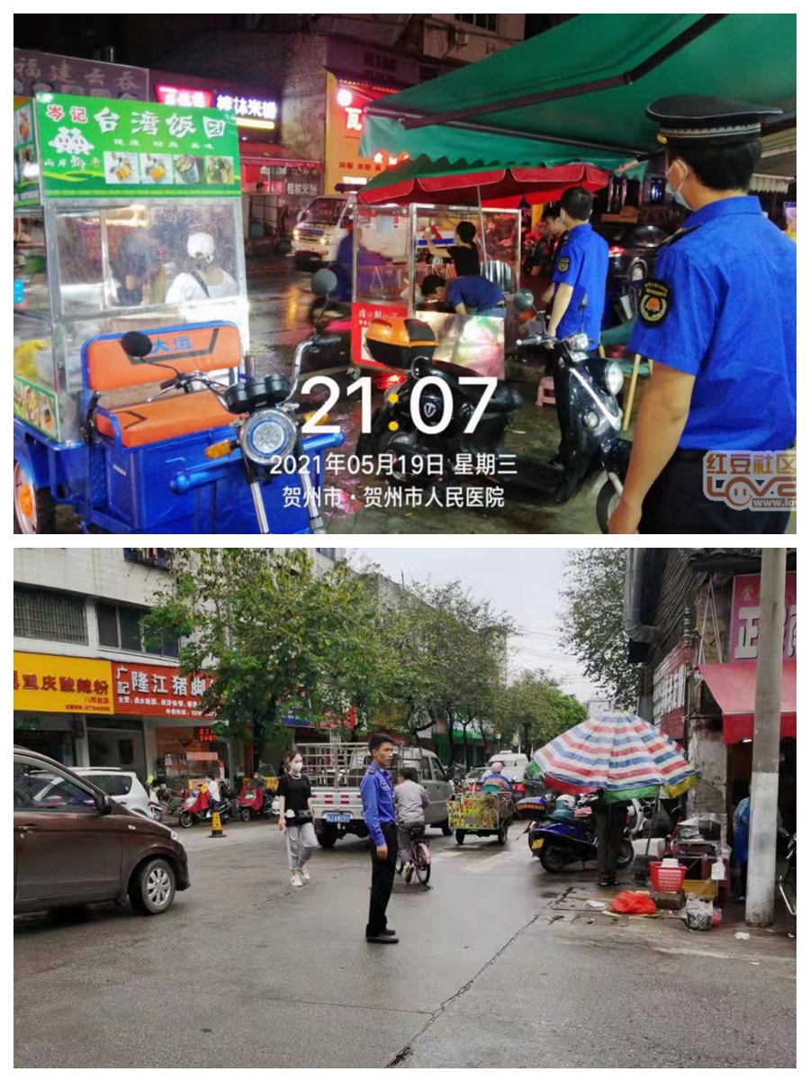 贺州市八步区西约街贺州学院东校区路段属老旧城区,街道路面狭窄。该路段有贺州市人民医院、贺州学院等人流量较大的场所,对食品、餐饮的需求量大无形中促进了该路段的商业发展,商贩云集,门店众多。我局长期以来对该路段进行“五乱”管控,由于执法力量有限,整个城区“五乱”管控点多、线长,执法压力巨大,目前暂不能实现对某一路段进行蹲守式的管理。
