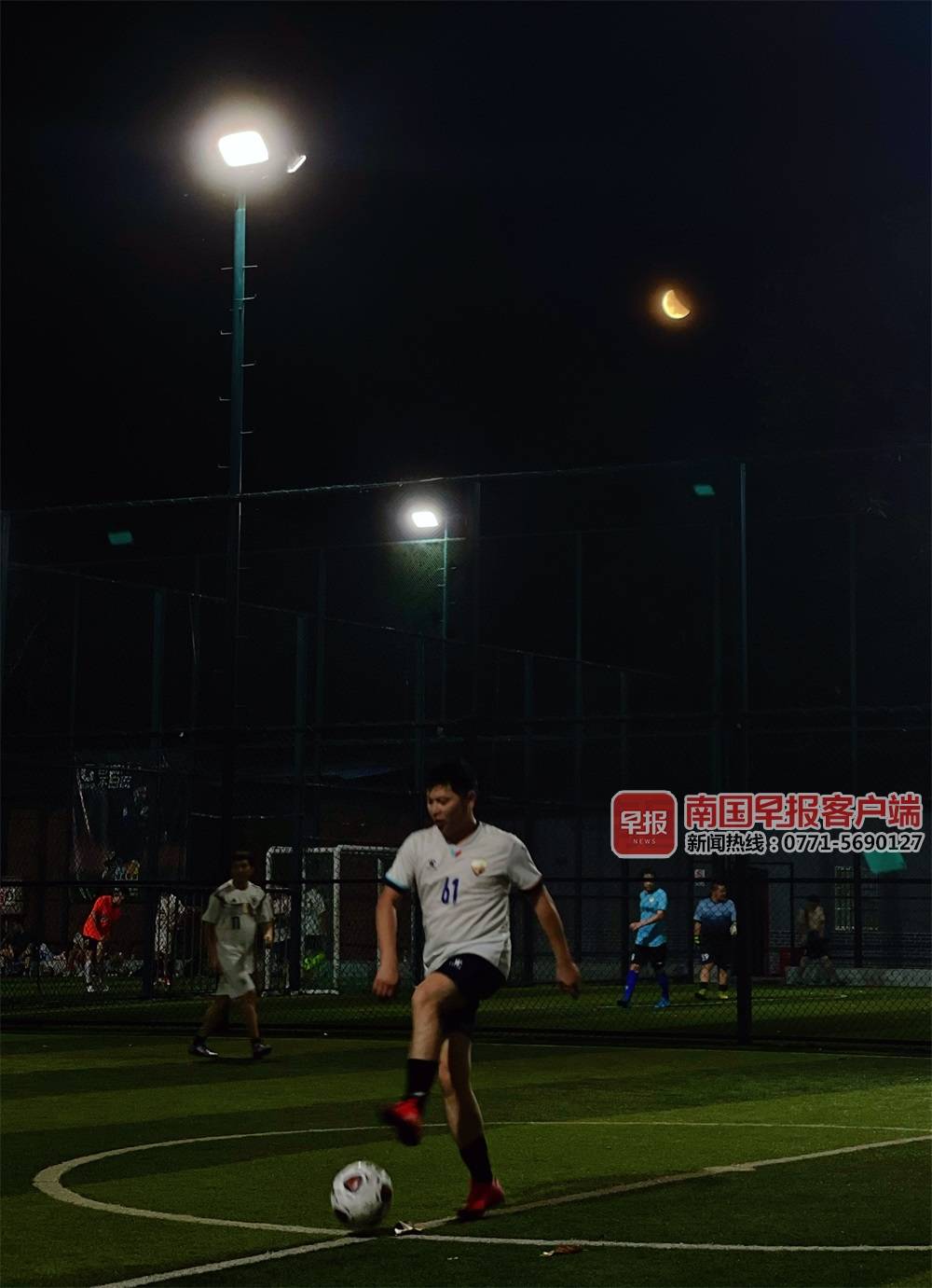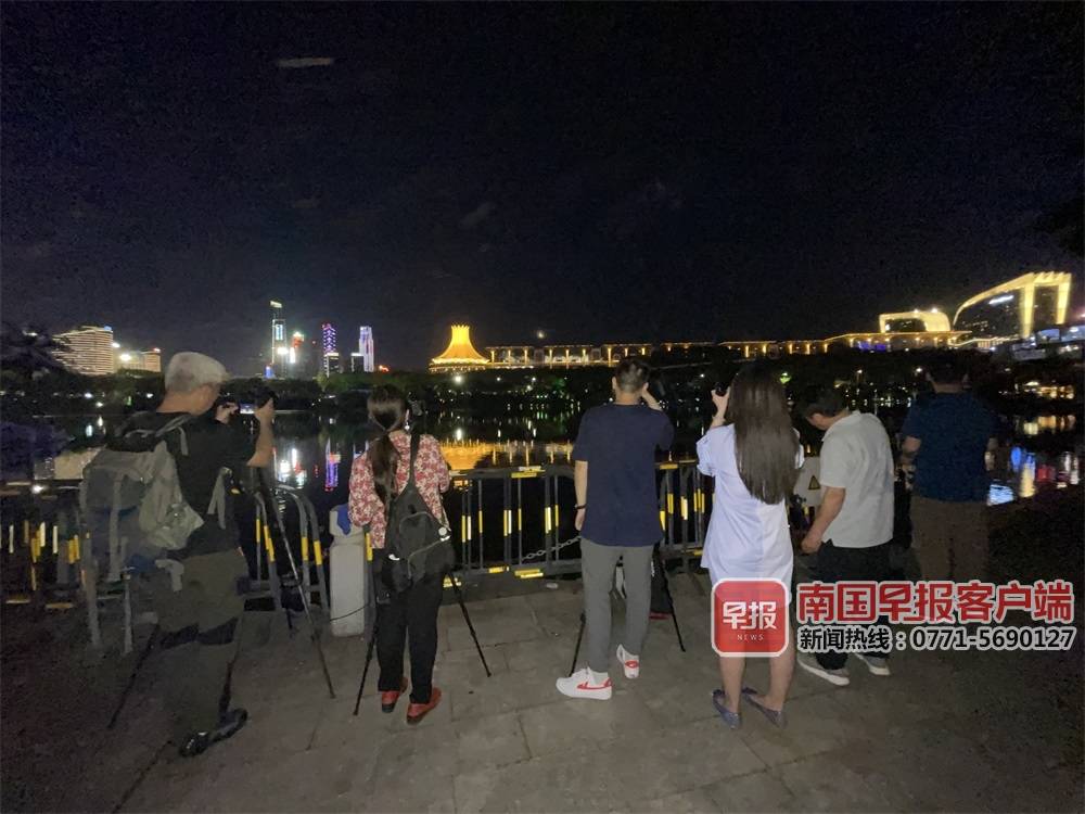 ▲26日晚8时15分,南宁市民歌湖一带,可以清晰看到月食。