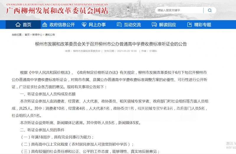 柳州市发展和改革委员会今天在其官网发布《关于召开柳州市公办普通高中学费收费标准听证会的公告》(以下简称《公告》),明确告知社会各界,根据《中华人民共和国价格法》、《政府制定价格听证办法》有关规定,柳州市发展改革委拟于6月下旬召开柳州市公办普通高中学费收费标准听证会,对该市市属、县属公办普通高中学费收费标准调整方案的必要性、可行性进行公开听证,广泛征求社会各方面的意见。如愿意参加,各界人士现在就可以报名。主要内容和重点如下: