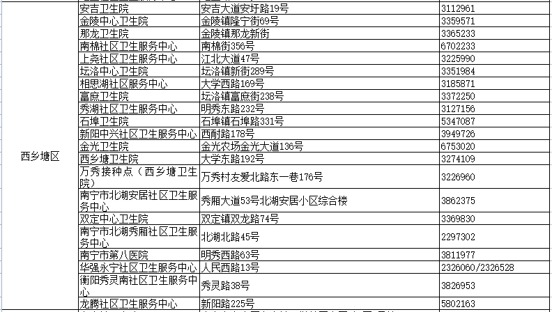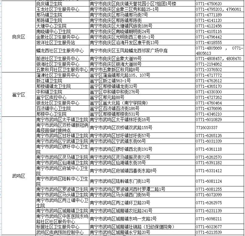 南宁市各县区、开发区新冠疫苗接种单位信息一览表