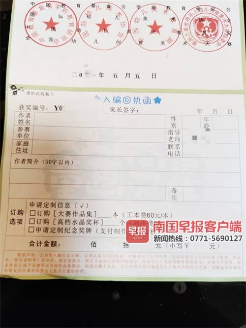 彭女士的孩子就读南宁市银蕾幼儿园,五月下旬从幼儿园带回一张奖状。上面显示,孩子的一幅绘画作品获得“童画之星·第二十三届全国幼儿创意美术大赛”书画类的金奖,并获得大型儿童画册《全国幼儿创意美术大赛优秀作品选》的入选资格。此外,还有一张“入编回执函”,提示家长,交纳10元可获得定制纪念奖牌,交纳60元可获得高档水晶奖杯或者大赛作品集。