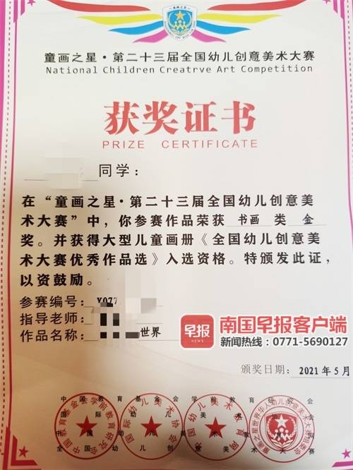 4岁幼童拿“金奖”要花钱配套 南宁一家长质疑