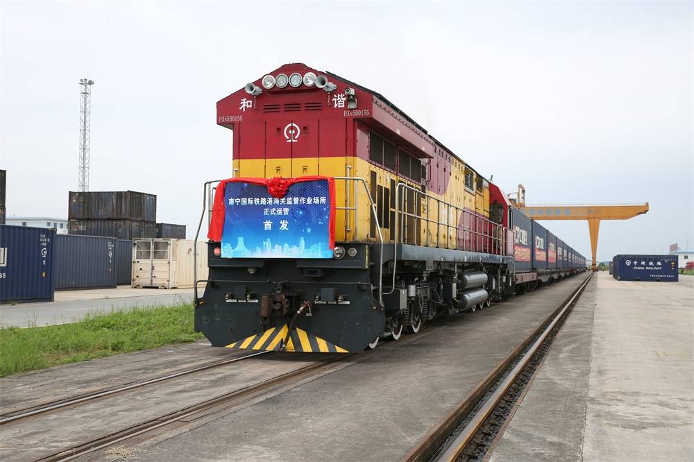 ▲5月30日,在南宁国际铁路港海关监管作业场所完成通关手续的中越班列,从南宁国际铁路港鸣笛启程开往越南河内。