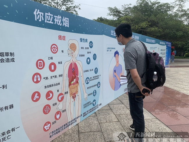 在活动现场,戒烟志愿者代表上台宣读了《第34个世界无烟日倡议书》,号召拒绝烟草,珍爱生命,减少疾病,引领健康,共创一个没有烟草危害的和谐社会。为进一步给市民科普戒烟对身体的好处,倡导大家加入戒烟行列中来,活动现场还摆放了很多关于控烟戒烟的宣传展架,前来参与活动的市民纷纷上前观看阅读,了解关于控烟的知识、吸烟的危害。同时,自治区疾控中心、自治区人民医院、广西医科大学第一附属医院、南宁市第一人民医院等医疗卫生机构的专家还现场开展健康咨询义诊活动,为市民提供戒烟咨询,并发放科学戒烟的宣传资料,呼吁广大烟民为了自己和家人的健康,远离香烟的侵害,主动戒烟。