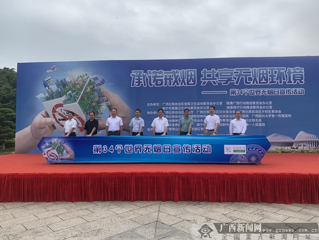广西新闻网南宁5月31日讯(记者 李冠宏)2021年5月31日是第34个世界无烟日,为贯彻落实《健康中国行动(2019-2030年)》控烟行动有关要求,有效提升人民群众烟草危害健康知识水平,5月31日上午,广西第34个世界无烟日宣传活动在南宁市青秀山壮锦广场举行。自治区和南宁市的机关干部职工、医疗机构专家和健康家庭、健康企业等“健康细胞”代表和市民共同参与活动。