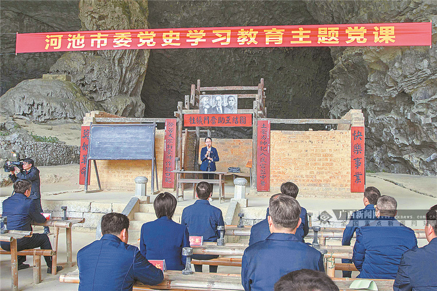 党史学习教育启动以来,河池市组织各级党员干部瞻仰广西农民运动讲习所旧址,并在列宁岩内上主题党课,让党史学习教育入脑入心。记者 卿要林 摄