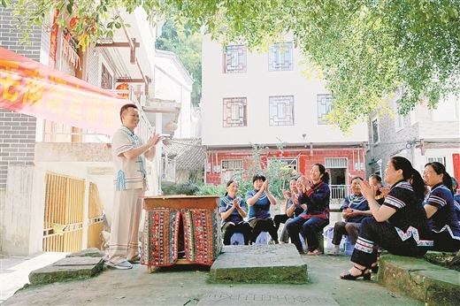 5月13日,环江毛南族自治县在毛南族发祥地下南乡中南村南昌屯举行党史学习教育毛南语宣讲报告会,宣讲团成员用毛南语唱起《十颂党恩》,讲述家乡变化。颜 瑜 摄