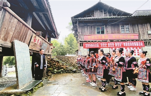 近日,龙胜各族自治县平等镇龙坪村老支书在红军楼前用侗族语言为党员群众讲述当年红军过龙坪村的故事。今年以来,该县结合建党100周年的红色主题,充分发挥红色资源优势开展党史学习教育,进一步增强党员群众爱党爱国情感。吴生斌 吴凯旋 摄