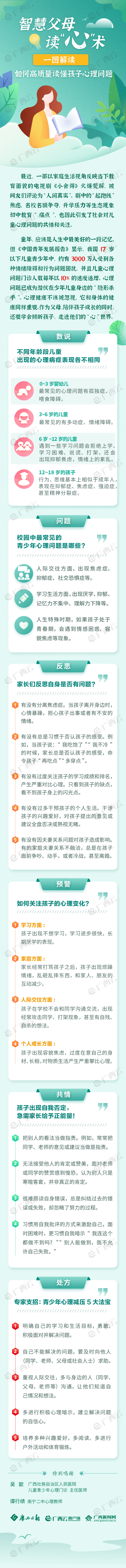 孩子出现了心理问题的苗头,家长往往会认为那是“矫情”,一旦忽视极可能酿成“大祸”。研究表明,心理问题它可能因为环境和遗传共同诱发,不同年龄段的孩子所面对的世界可能远比我们想象的复杂,成长过程中有太多细节容易被忽略。如何走进他们的内心世界、聆听他们的心声、重视他们的需求,是所有父母和心理健康教育工作者都应该重视的课题。为此,广西壮族自治区人民医院儿童青少年心理门诊主任医师吴歆为父母和孩子提供了一份家庭必备的心灵“鸡汤”,为孩子健康成长提供心理营养。