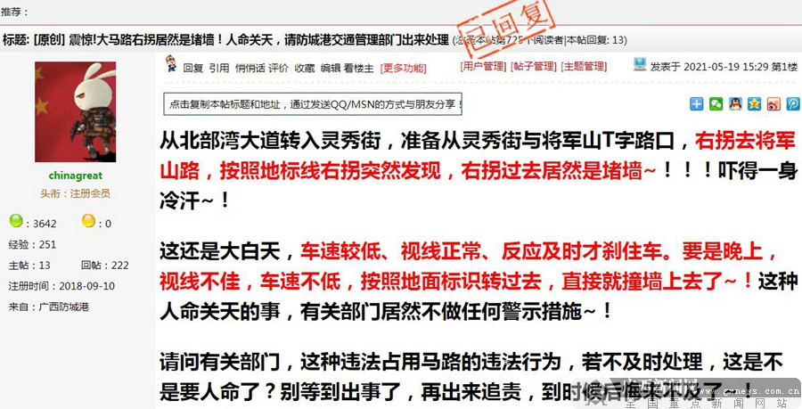 5月25日,防城港市市政局就《震惊!大马路右拐居然是堵墙!》一帖进行回复:关于您反映港口区中心区灵秀街与将军山路交汇处围墙占用道路的问题,我局及时进行现场调查。经查,该围墙是广西金狮城地产有限公司所建设的三顺世纪大都会项目配套设施,目前该公司正处于破产重组阶段,项目已被法院查封,按规定项目在重组结算前不能有现状改变,因此此围墙在该公司重组结算前无法拆除。同时,我局已会同相关部门在辅道路口设置安全警示标志,请市民朋友们途经时注意观察,安全通行。