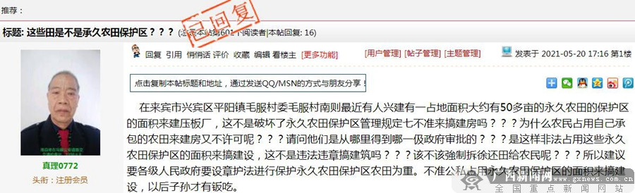 5月24日,来宾市兴宾区平阳镇人民政府就《这些田是不是承久农田保护区?》一帖进行回复:您反映的压板厂位于兴宾区平阳镇桥林村委毛服村南侧,共有25.399亩。经区自然资源局认定审核,该地块属性为其他草地,不属于基本农田,未违反基本农田保护管理条例。如有其他疑问,可到镇党政办现场查阅核实有关认定审核材料,或电话反馈:0772-4972189。感谢您给我们提出的意见和建议!