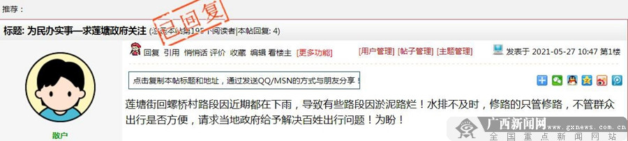 开栏语:习近平总书记强调:“网民来自老百姓,老百姓上了网,民意也就上了网。群众在哪儿,我们的领导干部就要到哪儿去。各级党政机关和领导干部要学会通过网络走群众路线,经常上网看看,了解群众所思所愿,收集好想法好建议,积极回应网民关切、解疑释惑。”广西新闻网红豆社区推出独家专栏——《问政广西》,旨在构建网民与政府职能部门的沟通桥梁,促进双方良性互动对话,传播正能量,共画网上网下同心圆。