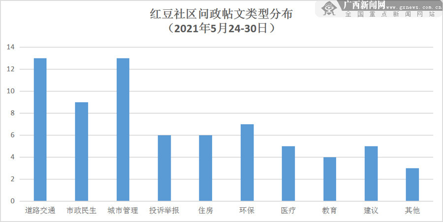 据统计,5月24-31日期间,网民反映各类问题较多,其中道路交通和城市管理类问题最多,占比达18%;其次为市政民生类问题,占比为13%;另外,环保、投诉举报、住房类问题的帖文也受到一定关注。