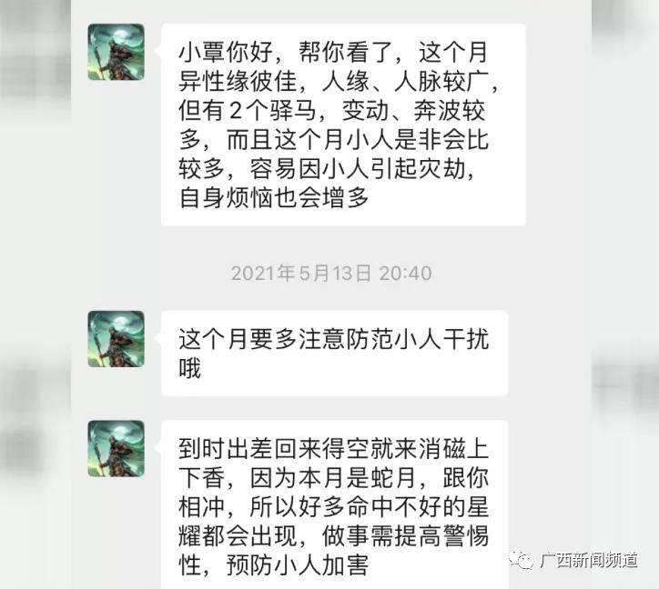 覃女士称,店里面就给她算那些运势命理之类的,然后就算我这里不好,那里不好。比如说生命健康问题, 很容易得病,然后又容易出现灾祸,那些大的。
