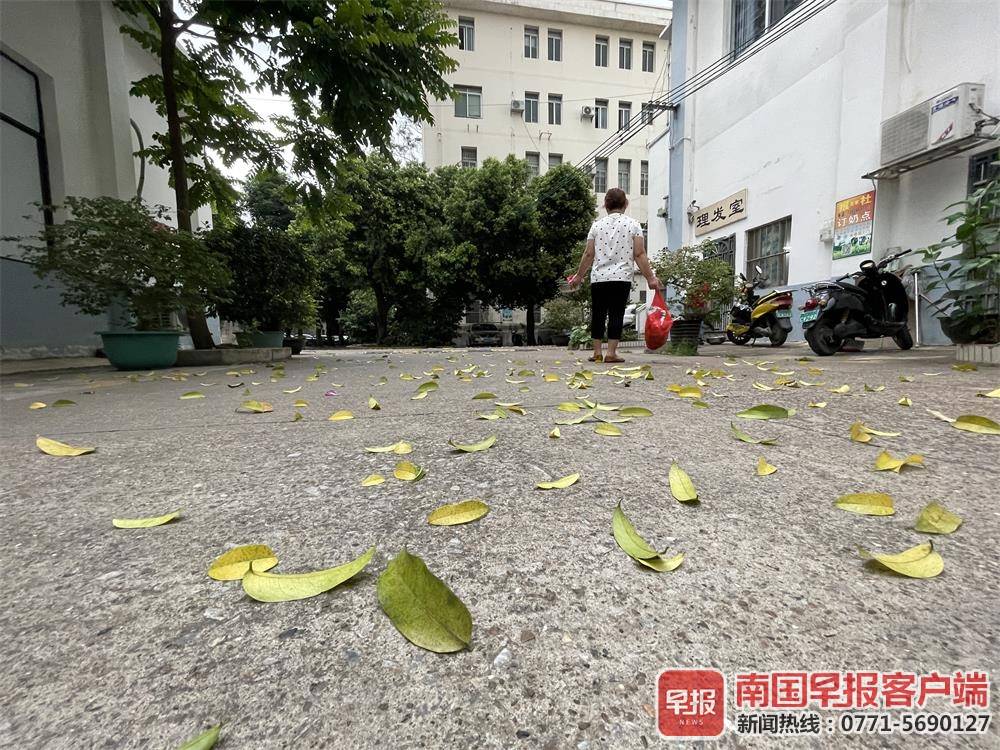 ▲6月3日,南宁市多云天气。古城路一小区内,树叶被吹落一地。南国早报客户端记者 邹财麟摄
