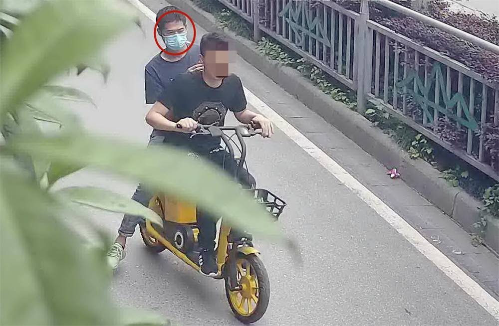 ▲闫某斌骑电动车,后排戴口罩的男子为嫌疑人闫某。视频截图