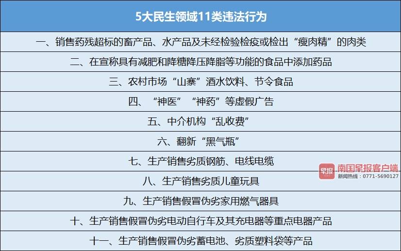 据介绍,自治区市场监管局通过梳理分析12315平台投诉举报情况、市场监管舆情监测热点和风险点、相关行业抽检情况,将食品、广告、价格、特种设备、重点工业品产品质量等5大民生领域的11类违法行为作为此次行动的执法重点。