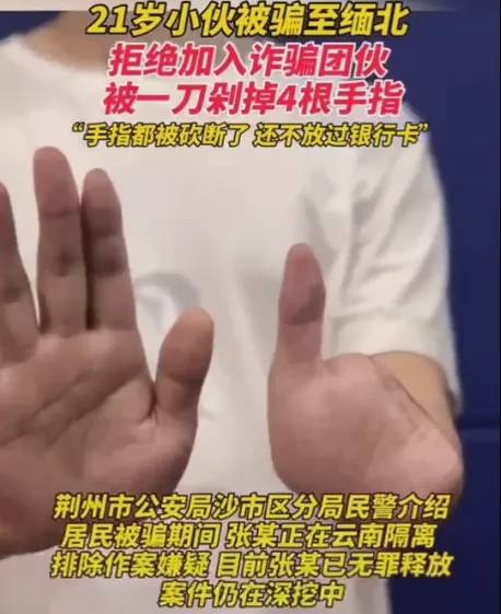 前段时间,很多人都看到过这张触目惊心的图,一个小伙只剩下6根手指,说的是这名四川小伙被“铁网友”骗去缅北,强迫他搞诈骗,不干就叫家里人拿12万赎人,或者一根手指3万。这名倔强的小伙不肯同流合污,家里也根本拿不出这笔巨款,小伙最终在一群魔鬼的见证下,留下了4根手指,银行卡被搜刮一空后才被拖到边境自首点。