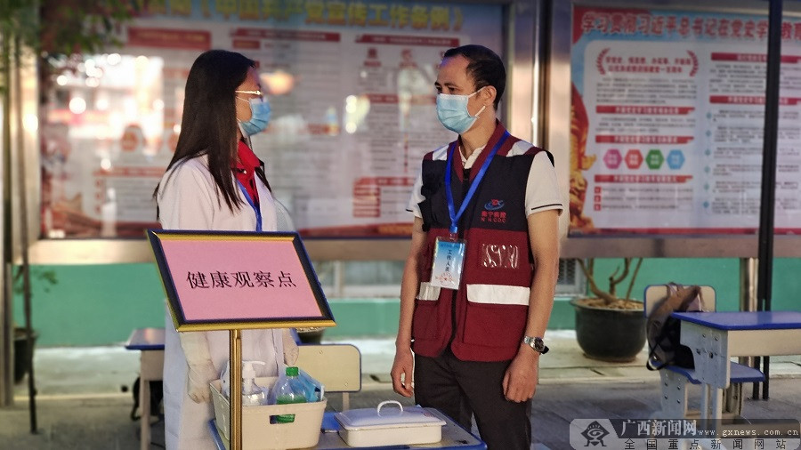 在南宁市二十六中考点,疾控人员在考场外落实防疫工作。广西新闻网 记者 黄玲娜摄