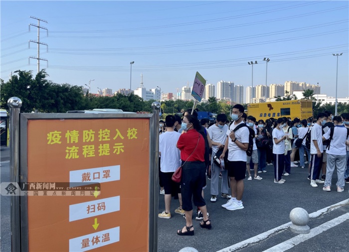上午8时许,在玉林市直考区玉林高中考点,统一乘车和自行前往的考生已陆续到达校门口,在现场工作人员引导下排队走进测温通道,有序进入考场。“同学加油!高考必胜!”送考老师们再次与学生核对身份证、准考证材料,叮嘱考场注意事项,清点考试用品,为学生壮行。不少身穿旗袍的妈妈们到场为孩子加油打气,有的还送上向日葵花束,寓意旗开得胜、一举夺魁、金榜题名。“我们7点半就来到了,希望孩子正常发挥、考出水平,考上理想的学校。”考生父母吴先生和钟女士与记者分享了此刻送考的激动心情。