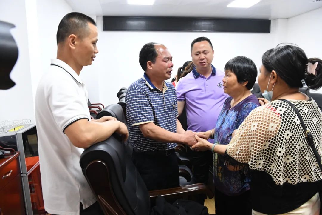 5月20日,在钟山县公安局的礼堂内举行了“我为群众办实事”团圆认亲活动。麦某辉在中山市公安局小榄分局民警的陪同下回到自己的家乡贺州钟山县,这个失散了30年的大家庭终于得以圆满团聚,也圆了杨某球、陶某妹夫妇多年的寻亲梦。