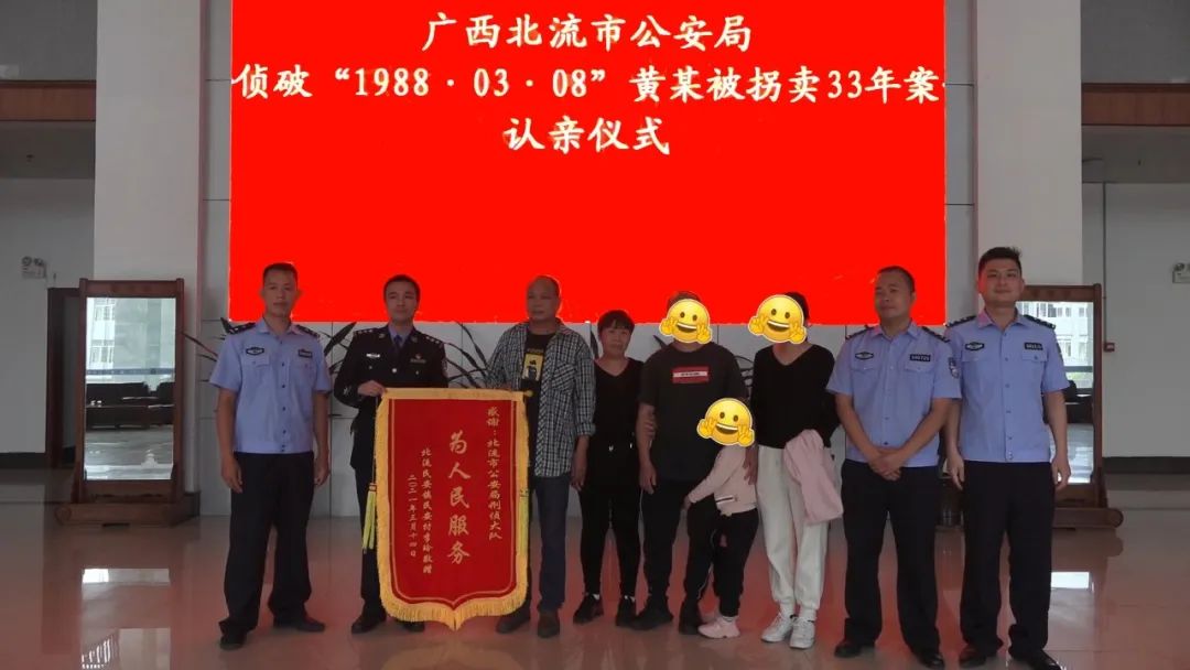 2021年3月14日,北流市公安局组织失踪儿童黄某和亲生父母黄某钊、李某夫妇在北流市公安局举行认亲仪式,这个破碎了33年的家庭成功团圆!