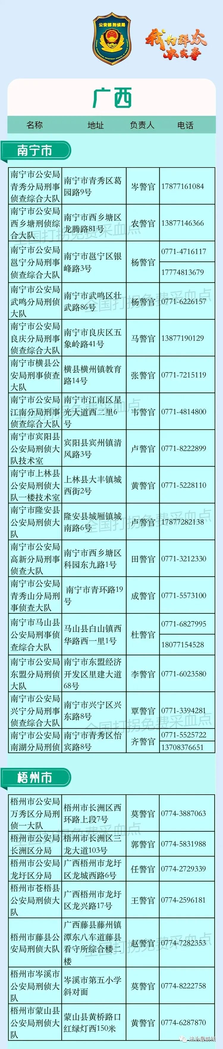为更好地运用科技力量、助力早日实现团圆,公安部近日对全国3000多个免费采血点信息进行了汇总整理、集中发布,其中广西设有30个免费釆血点,分布在南宁、梧州、玉林等地,其他城市的采血点也将陆续公布。