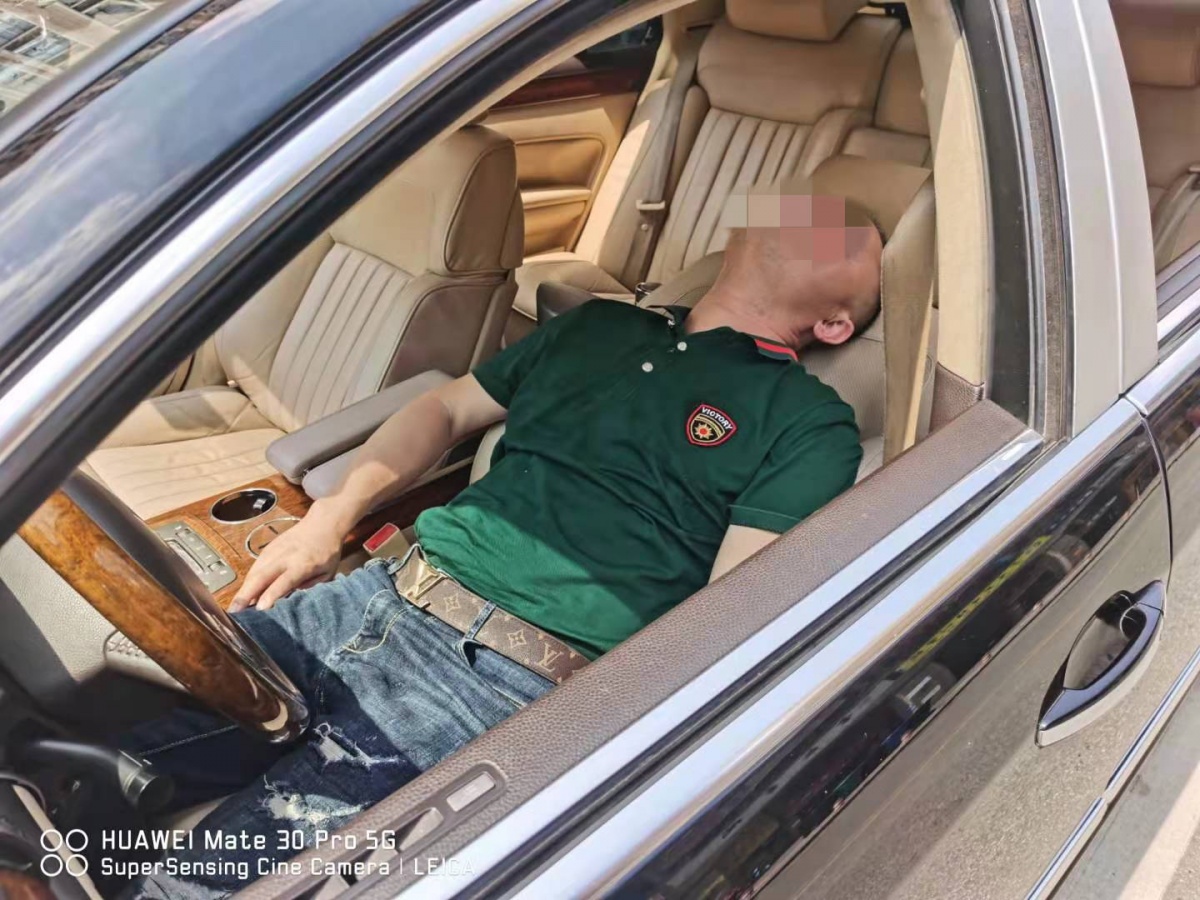南宁交警十大队民警闻讯赶到现场查看,经确认,车内有一名男驾驶员,躺在驾驶员座位上,经过近10分钟敲窗喊话,并无回应,起初怀疑车内人员有其他疾病,并报120。由于夏天炎热,司机开着空调。为了防止二氧化碳中毒,民警遂叫路边修车店的师傅打开车门。当车门打开时,一股浓浓的酒味扑鼻而来,司机已醉得不省人事。