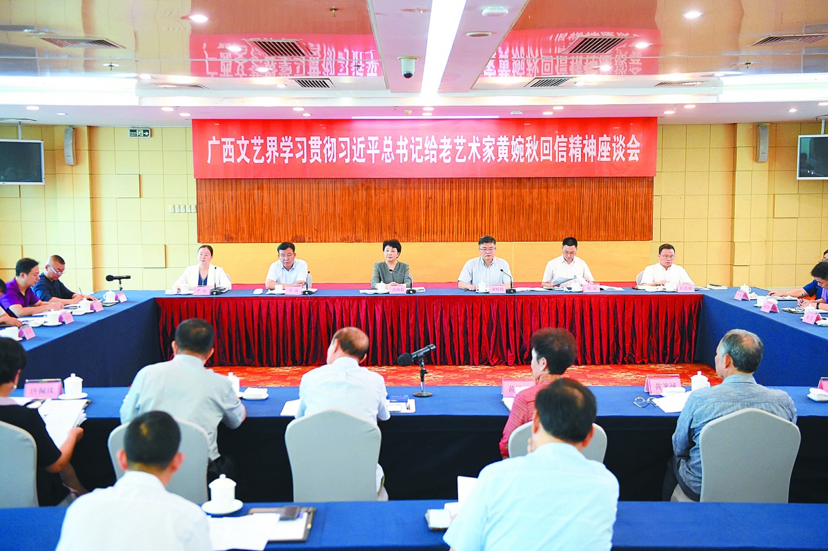 习近平总书记的回信对新时代文艺工作寄予了殷切期望,充分体现了总书记对弘扬民族文化的高度重视和对广大文艺工作者的关怀厚爱,让广西广大文艺工作者备受鼓舞、倍感振奋。6月10日,自治区党委宣传部召开广西文艺界学习贯彻习近平总书记给老艺术家黄婉秋回信精神座谈会,全区文艺界代表齐聚一堂,分享学习体会,交流思想认识,研究探讨如何推动广西文化文艺繁荣发展。大家一致表示,要牢记总书记的殷切嘱托,凝心聚力、担当作为,积极创作生产出更多反映时代精神、彰显桂风壮韵的优秀作品,以文艺的力量激励八桂儿女砥砺前行,奋力谱写新时代中国特色社会主义壮美广西的新华章。